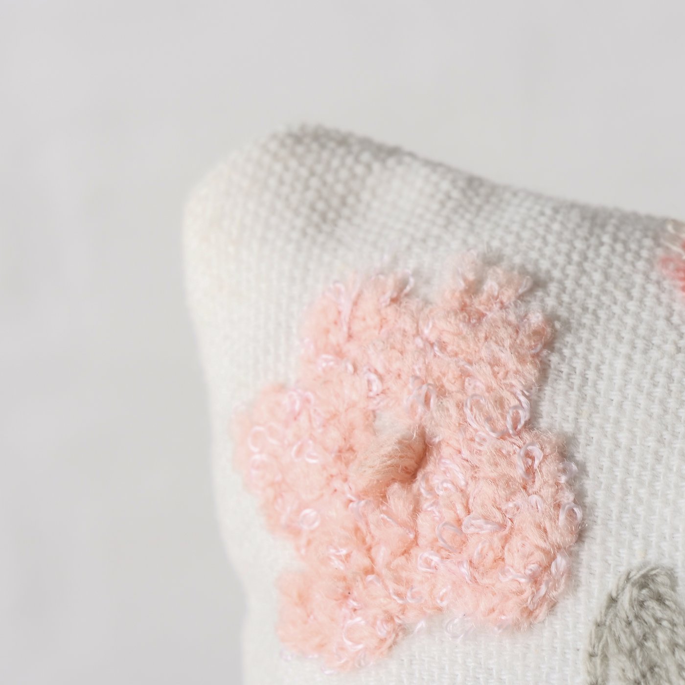 Beautiful handwoven cotton cushion with a pink and grey pretty floral design. This romantic design and pretty colours would suit any living area or bedroom. Comes with a polyester filler.