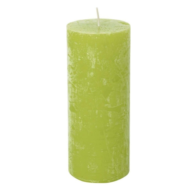 Non-scented rustic finish pillar candle in a lime green. Available in three assorted sizes.