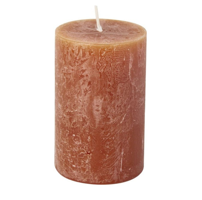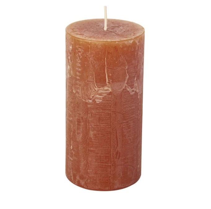 Non-scented rustic finish pillar candle in terracotta orange. Available in three assorted sizes.