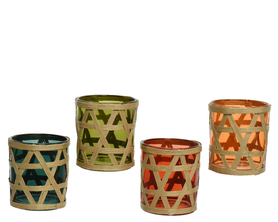 Set of four colourful tealight holders with a paper weave detail. Perfect for long Summer evenings.
