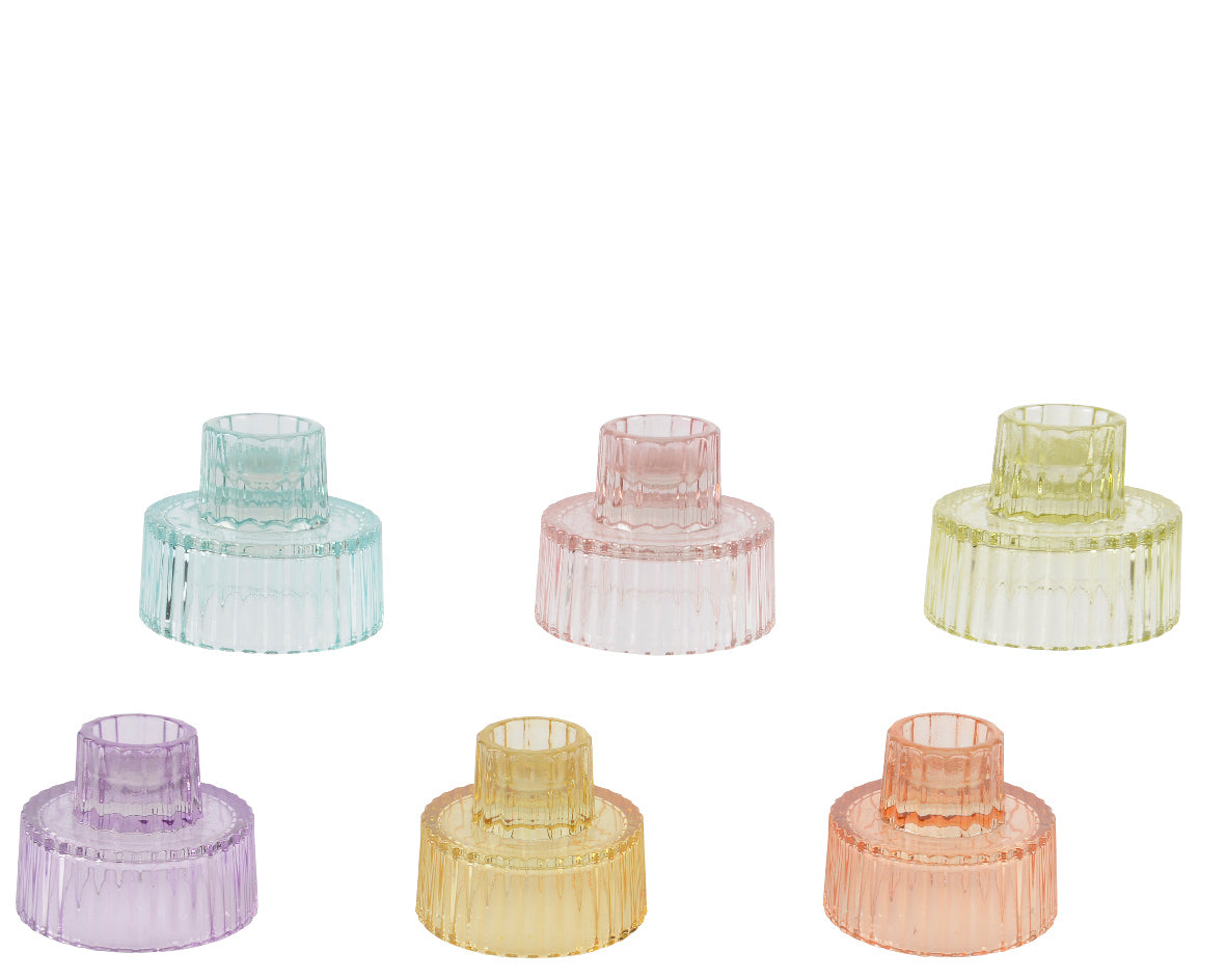 Set of six glass dinner candle holders is an assortment of pastel colours.