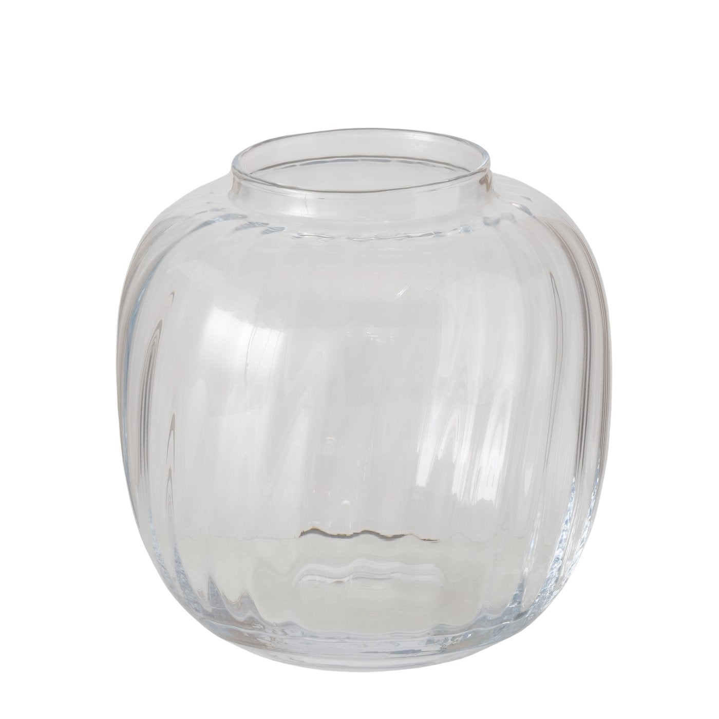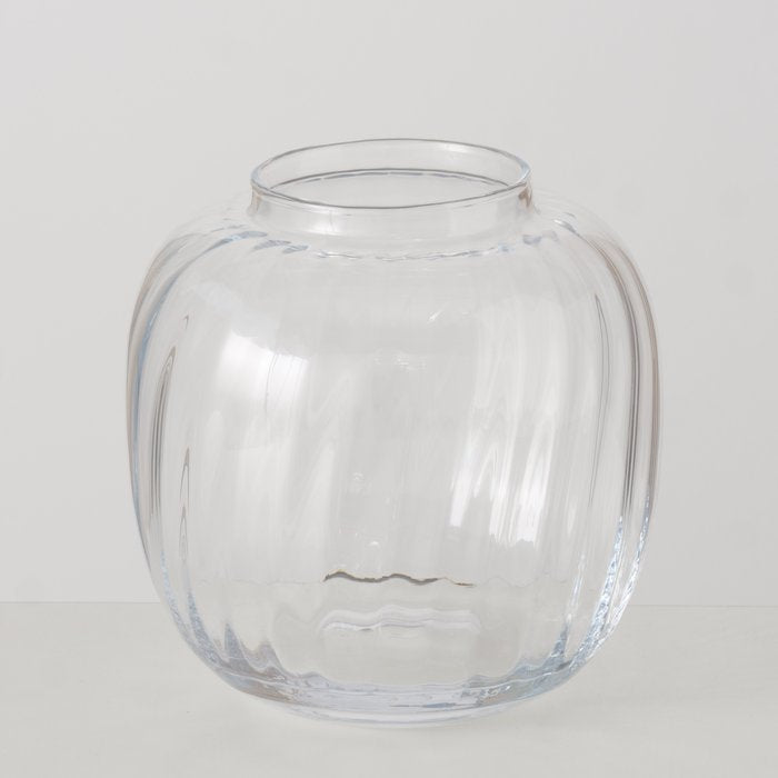Classic hand-crafted clear glass round vase with a rippled effect. Perfect addition to any room.