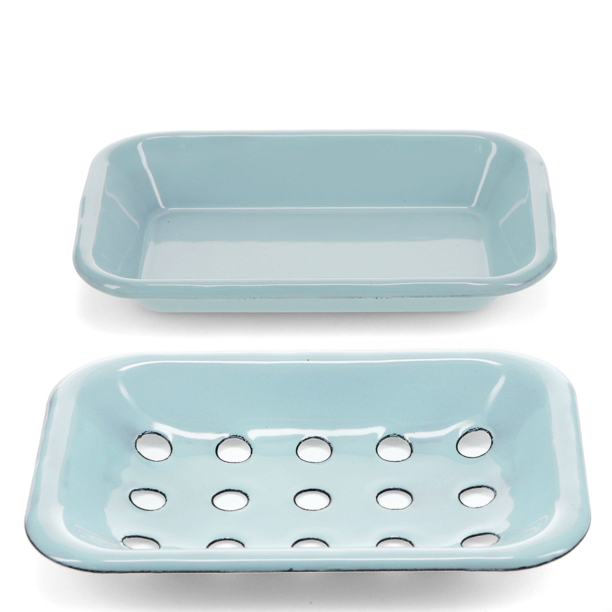 Retro style enamelled metal soap dish in blue, with distressed edging details in black. Adds a rustic charm to bathrooms with its classic appearance. Its two-part design, including rest with drainage holes and drip tray to collect drained water, is great for keeping bars of soap as dry as possible, extending their lifespan.