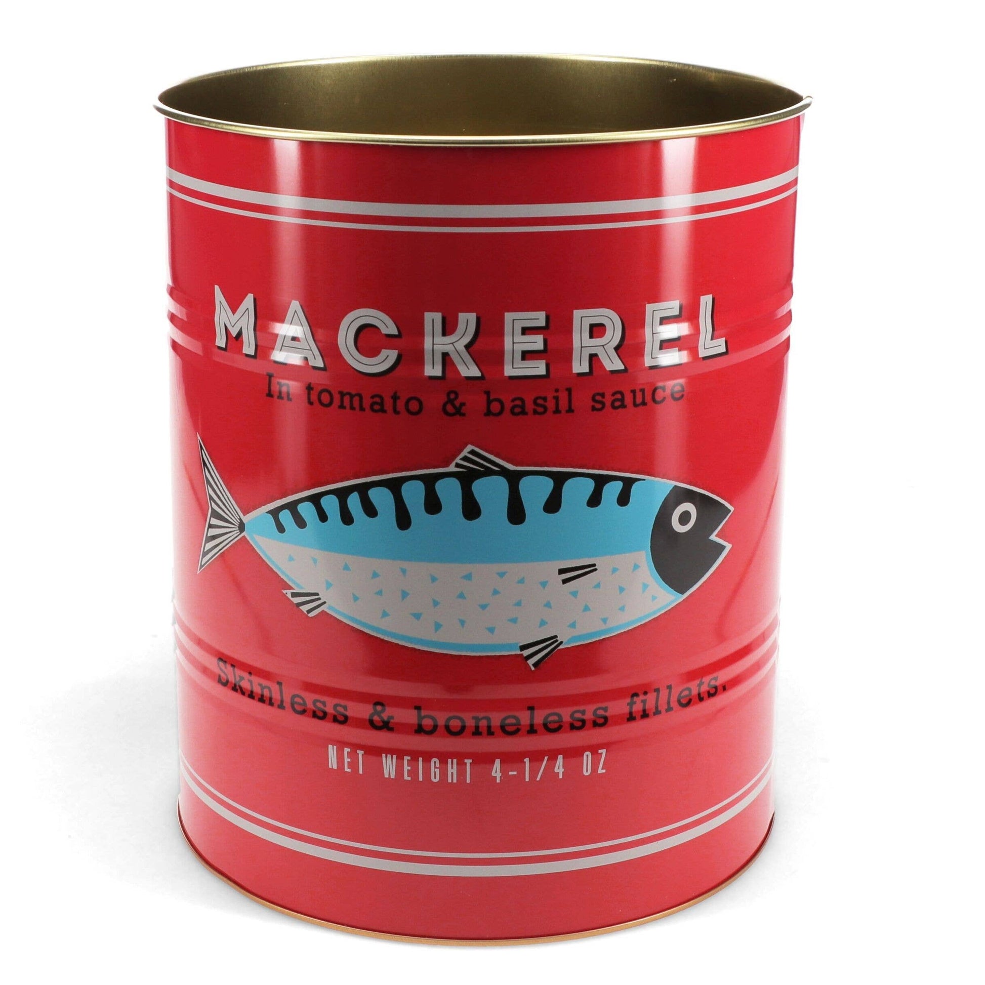 Pair of XL metal storage tins with retro style anchovy and mackerel fish branding, inspired by vintage food cans. Ideal for organising and displaying larger items, including craft tools and more.